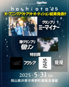 hoshioto’25のオープニングアクト出演を決める「hoshioto’25オープニングアクトオーディション」グランプリは「ミーマイナー」準グランプリは「個リン」特別賞として「是是」と「フクシア […]