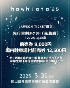 hoshioto’25の先行早割チケットを 12/25(水)12:00~ 1/19(日)23:59 まで販売します! 通常のチケットよりも少しだけ安い早割チケットを期間限定でLAWSON TICKETのみで販 […]