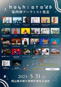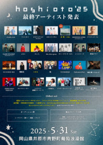 2025年5月31日(土)岡山県井原市青野町葡萄浪漫館にて「hoshioto’25」を開催します。「最高の星空の下で最高の音楽を」笑顔でお会いしましょう! 開催概要 公演名称 hoshioto’2 […]