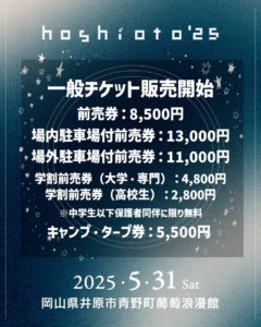 hoshioto’25の一般チケット販売が1/23(木)12:00から販売開始となります! 先行早割で売り切れてしまった、場内駐車場付前売券もプレイガイドにて販売いたします!また、先行早割ではなかった、場外駐 […]